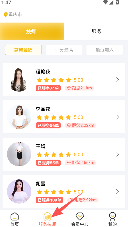 1、技师筛选直观,按距离、评分等排序,用户快速找到心仪技师,选择便捷。