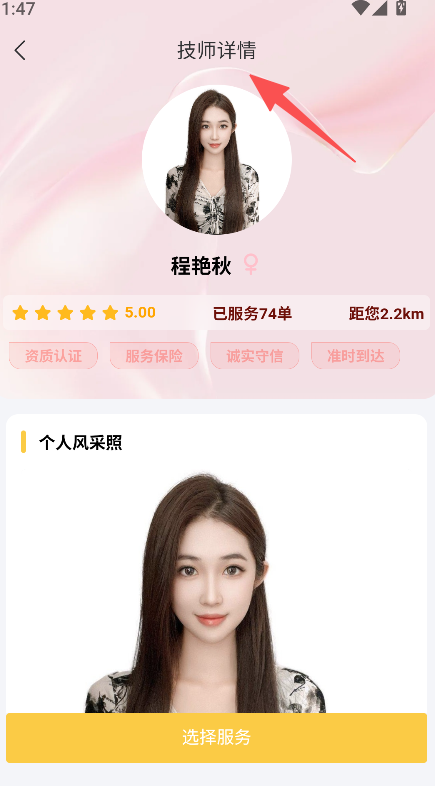 2、拥有技师详情功能,可查看资质、风采照,全面了解技师情况,保障服务选择。