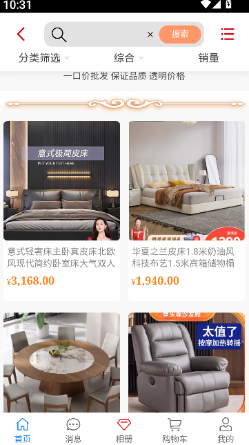2、在首页找到筛选功能入口,按品类、材质、价格、地区等条件精准筛选,快速锁定符合需求的家具产品。