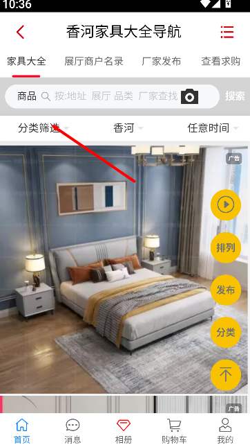 1、打开香河家具城软件进入首页,可直接浏览推荐的全品类家具商品,查看图文介绍、厂家信息及价格明细。