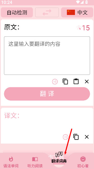 3、打开中日翻译词典功能,输入中文或日文内容,可查看翻译结果及假名注音,支持语音播报辅助理解。