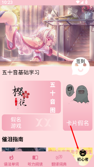 4、在初学者专属板块找到五十音图学习入口,切换清音、浊音、拗音进行听读训练,配合笔画动画掌握书写。