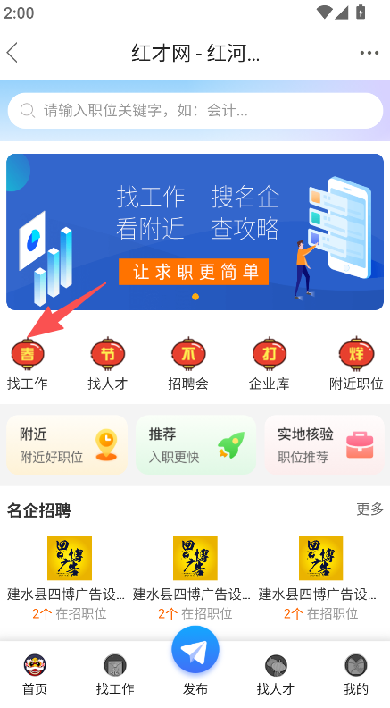1、打开软件,点击求职招聘,进入红才网求职板块。