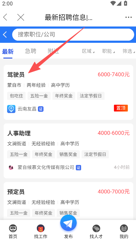 2、在求职页,可搜索职位或浏览最新招聘信息,如驾驶员岗位。