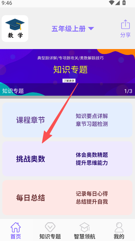 1、覆盖一年级至五年级上册多个年级,板块设置丰富,有知识专题、挑战奥数、每日总结,涵盖知识学习、学习总结多个学习维度。