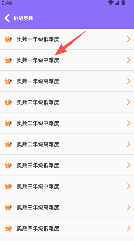 2、点击挑战奥数,选择对应年级和难度(如一年级中难度),可进行奥数题练习。
