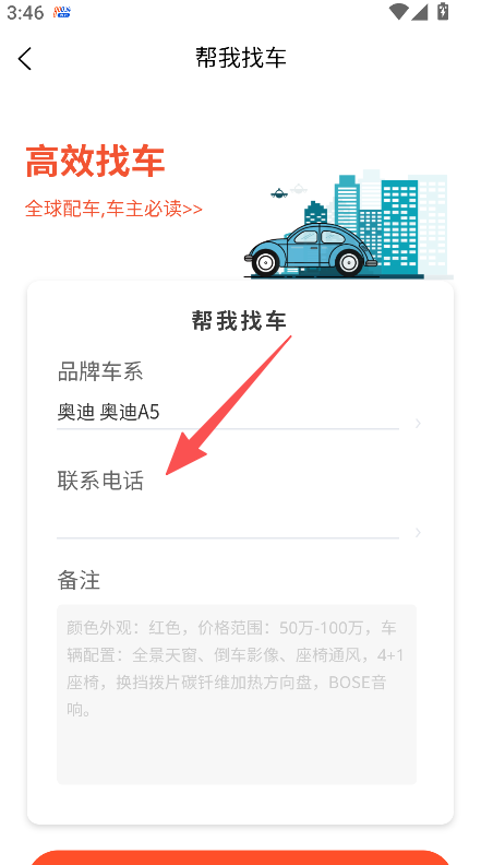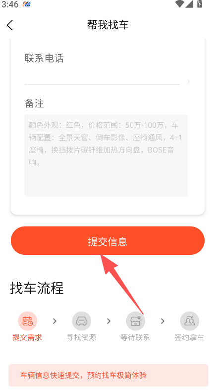2、需求填写细致,可选择品牌车系、填写联系电话及车辆配置、颜色、价格等备注,需求信息维度全,找车匹配度高。