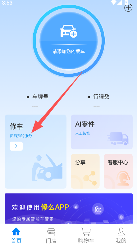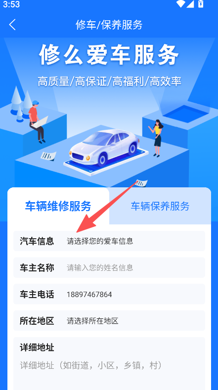 1、打开软件,点击修车,进入修车/保养服务页,填写汽车和车主信息。