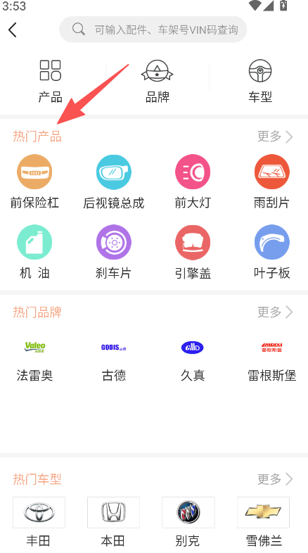 2、拥有配件查询功能,可查看前保险杠、刹车片等热门产品及多品牌配件,满足配件选购需求。