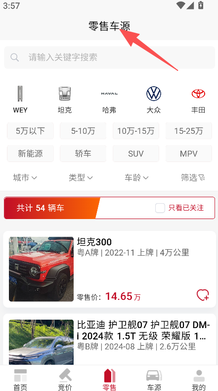 1、打开软件,进入零售车源,筛选品牌、价格等条件,浏览车辆。