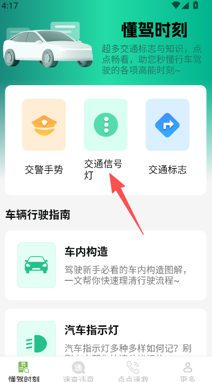 1、打开软件,进入懂驾时刻,点击交通信号灯,学习信号灯规则。