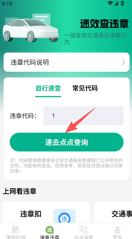 2、切换至速查违章,输入违章代码,点击速去点点查询。