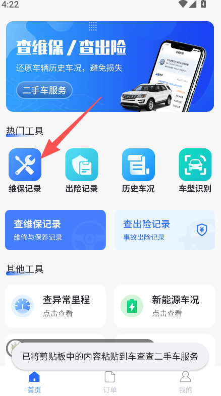 1、工具入口清晰,维保、出险记录板块直观,快速进入查询,操作便捷。