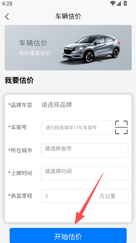 1、打开软件,点击车辆估价,填写品牌、车架号等信息,点击开始估价。