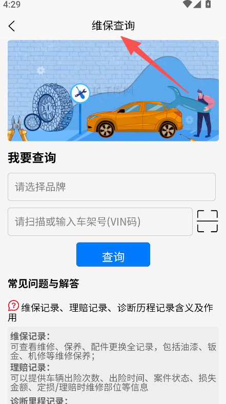 2、点击维保查询,输入车架号,点击查询,查看车辆维保记录。