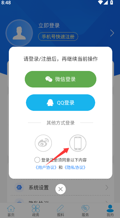 3、选择并点击"手机登录"这一选项,即可进入下一步的手机号验证环节。