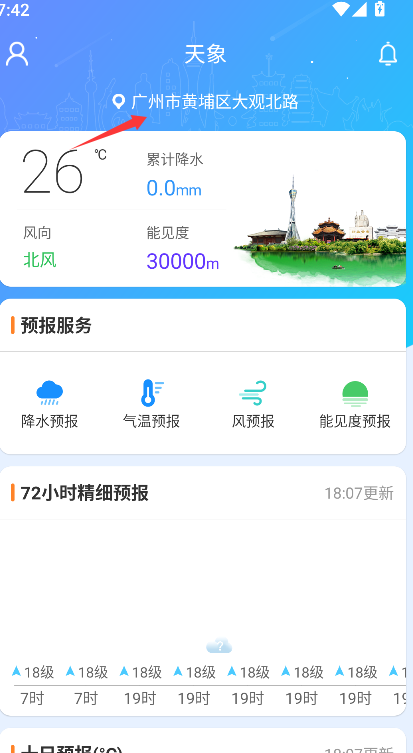 3、选择具体地区后,将跳转至该地的天气详情页面,在此可查看包括实时温度等天气。