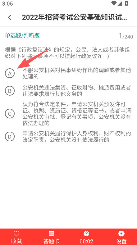3、进入真题页面,做辅警考试真题(如行政复议法题目),完成学习。
