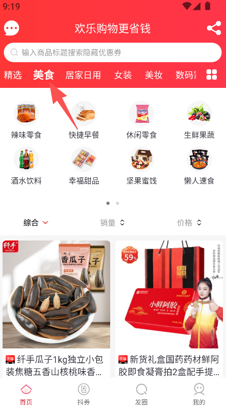1、进入首页,选择商品分类(如美食)。