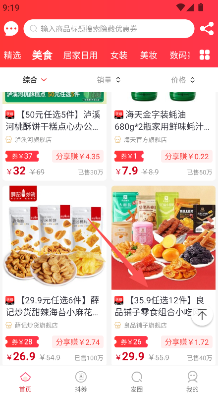 2、优惠方式多样,支持搜索隐藏优惠券,商品页可领券,如良品铺子零食券后29.9元,优惠力度明显,购物省钱有保障。
