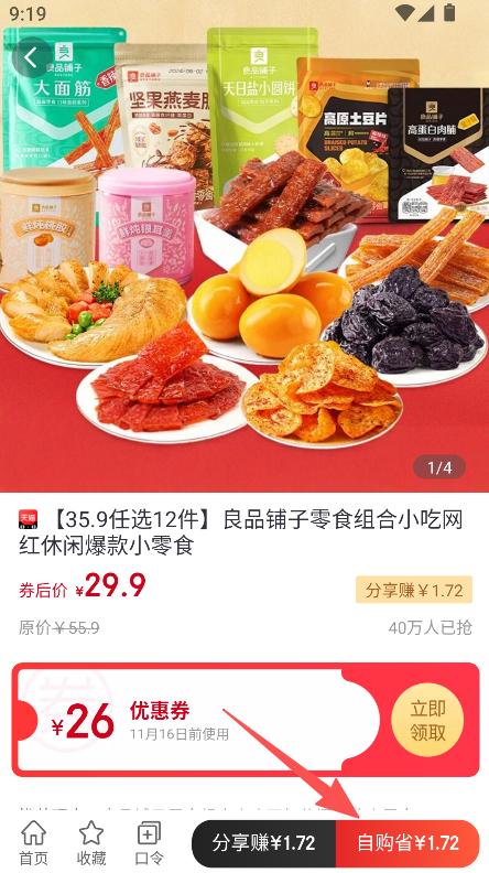 2、优惠券领取功能,商品页可领取隐藏优惠券,如良品铺子零食领26元券,大幅降低购物价格,实现低价购物。