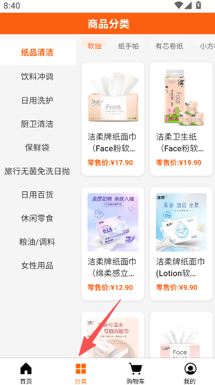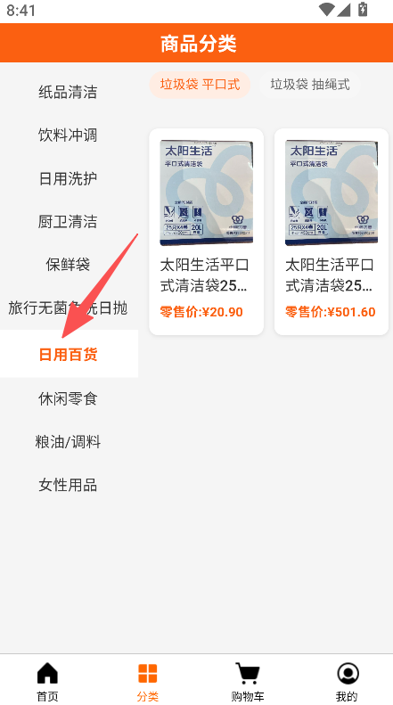 1、商品分类浏览功能,可在分类板块查看不同类别商品,如日用百货类的清洁袋、纸品类的纸巾,找到目标商品。