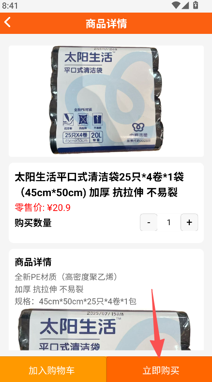 3、购物流程简单,选商品、看详情、选数量、购买或加购,步骤少,如太阳清洁袋的购买流程,购物体验顺畅。