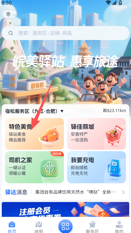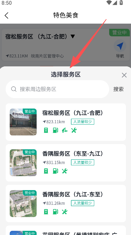 1、进入特色美食板块,选择服务区(如宿松服务区)。