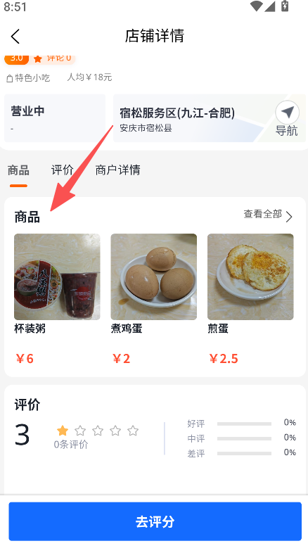 3、商品信息详实,店铺商品标注价格、类型(杯装粥6元、煮鸡蛋2元),用户清晰了解消费内容。