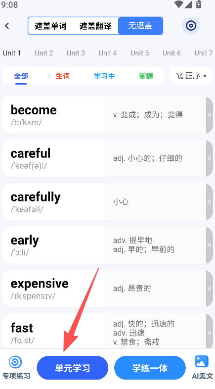 1、进入软件,点击学单词,选择单元学习。