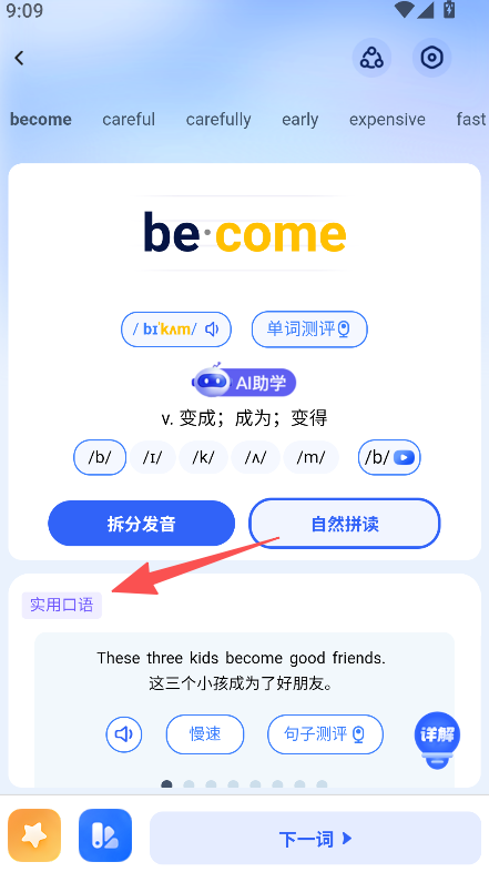 3、查看单词的拆分发音、自然拼读,学习实用口语例句,完成单词学习。