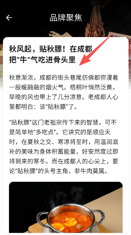 1、资讯内容诱人,品牌聚焦的美食资讯图文并茂,描述成都烟火气与美食关联,吸引餐饮爱好者关注。