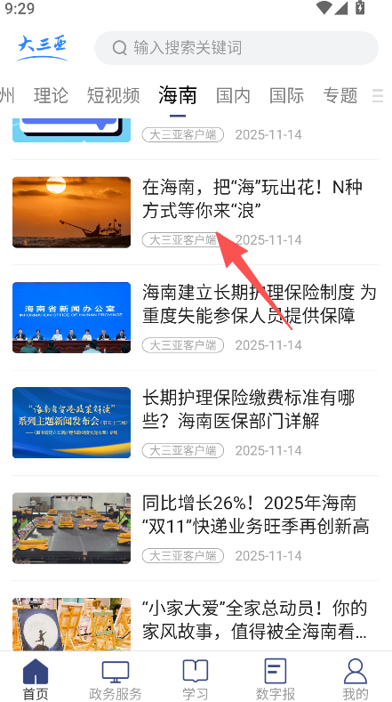2、板块布局清晰,新闻、政务服务、学习、数字报板块分类明确,用户可快速找到海南旅游、政策等资讯,操作高效。