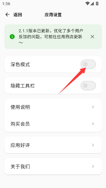 3、选中深色模式瞬间,界面如同披上优雅的夜空礼服,让书写体验在静谧的暗色调中焕发新魅力。