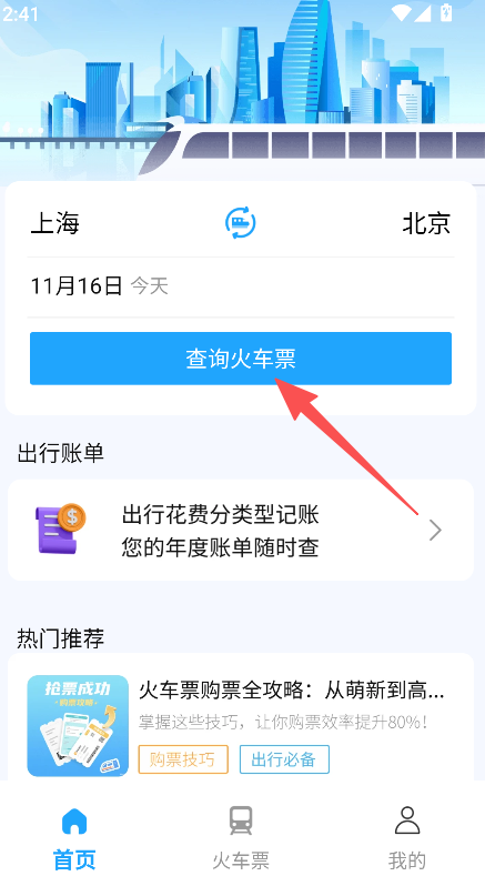1、进入软件首页,选定出发地、目的地及出行日期,点击查询按钮获取对应火车票信息。