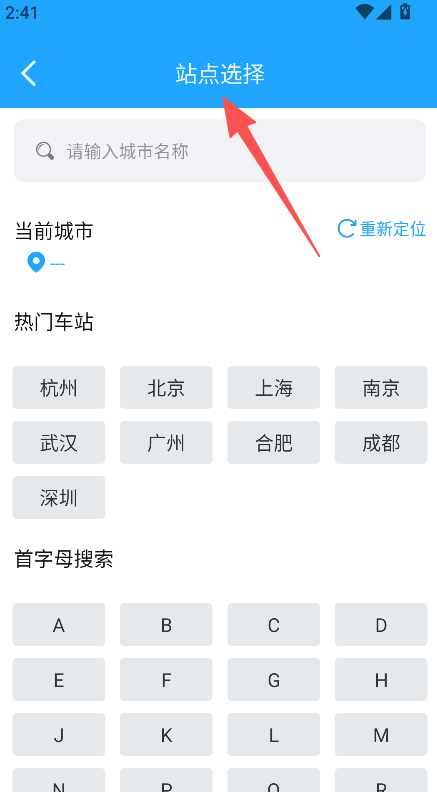 2、在站点选择页面,通过热门车站推荐、首字母搜索或定位功能,快速找到并选定目标站点。