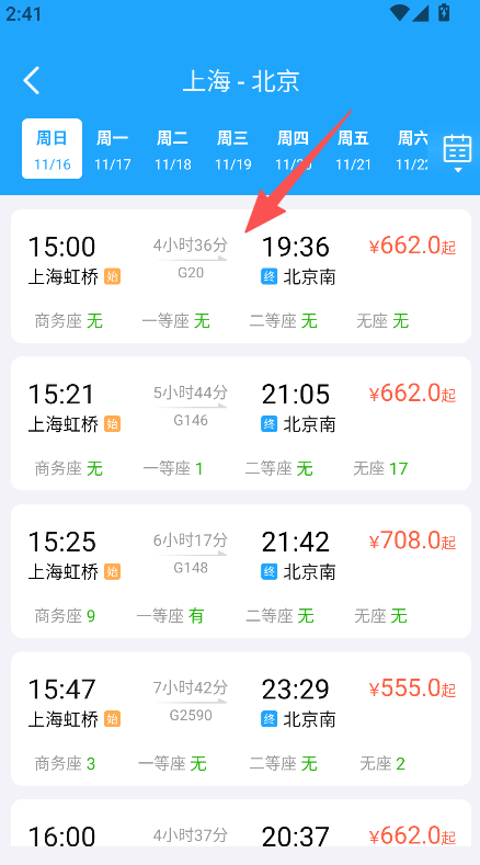 3、查询结果页中,查看车次的出发到达时间、历时、票价及各席别余票情况,掌握详细票务信息。