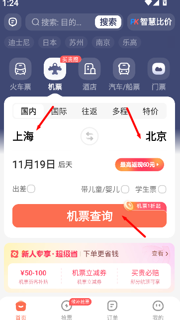 1、打开《铁友火车票》APP,在首页顶部导航栏选择 “机票”,输入出发地、目的地及出发日期,确认信息后点击查询按钮。