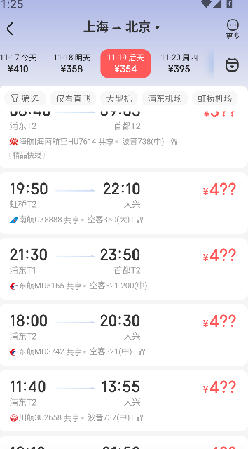 2、查询结果页展示各类航班信息,可查看起降时间、飞行时长、舱位等级及对应票价,按需筛选合适航班。