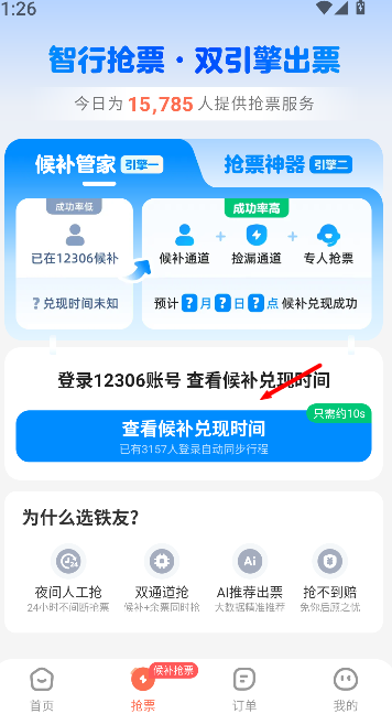 3、切换至 “火车票” 板块,选择目标车次后,若显示无余票,可查看候补购票选项,提交申请参与候补。