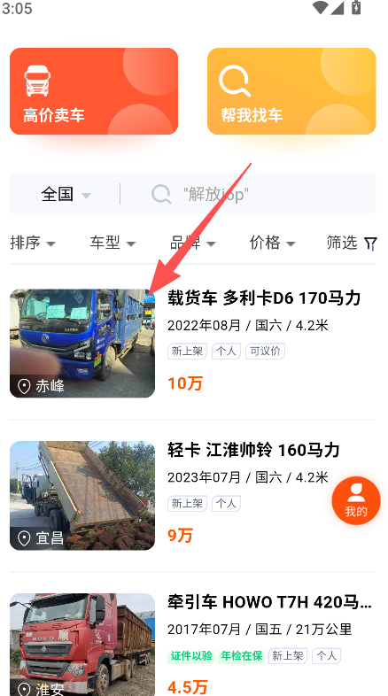 1、打开软件,选择二手货车类型或品牌,进入车源列表页。