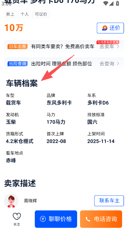 2、点击目标货车,查看车况、价格、手续等详细信息。
