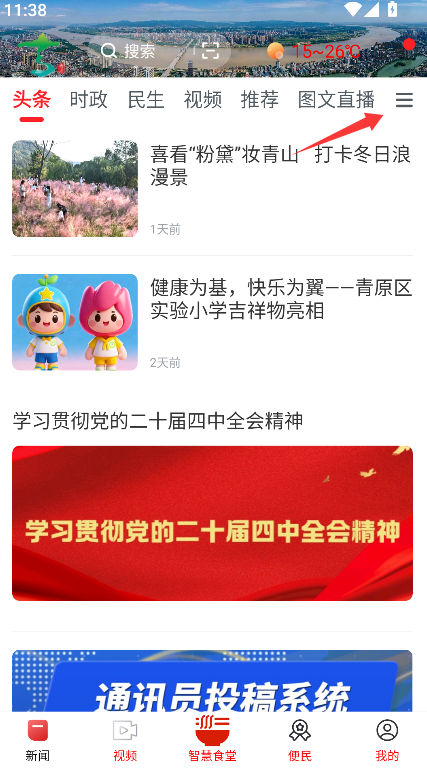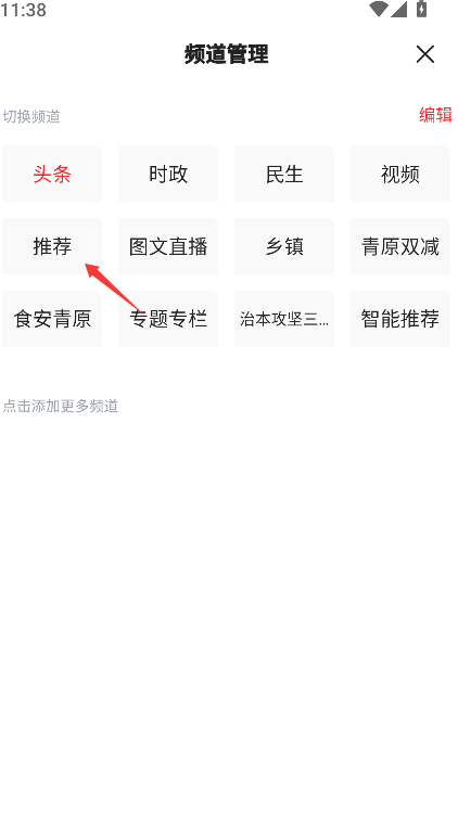 1、在首页界面右上角找到并点击由三条水平短线的图标,页面将跳转至频道管理界面。