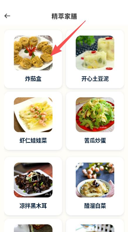 1、打开软件,选择菜谱分类(如精萃家膳),进入对应菜谱列表页。