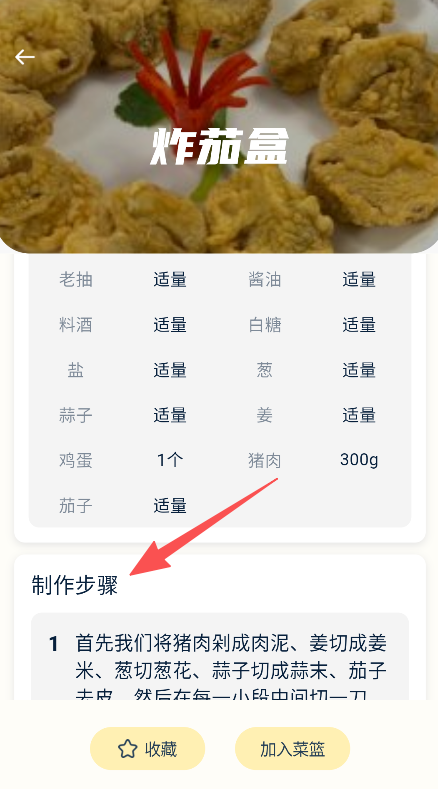 2、点击目标菜品(如炸茄盒),查看食材与制作步骤详情。