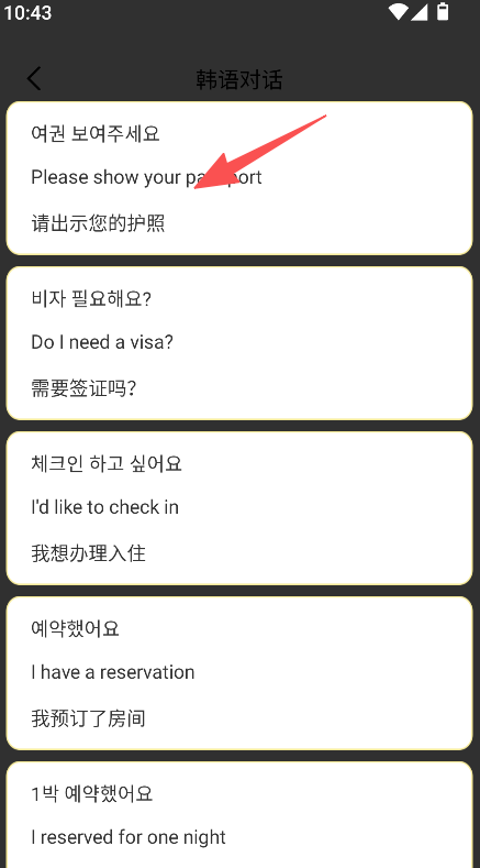 2、对话练习实用,涵盖日常、旅游等场景,韩语表达配中英释义,即使是韩语新手也能快速理解,应用于实际。