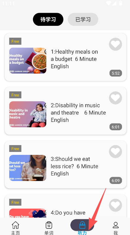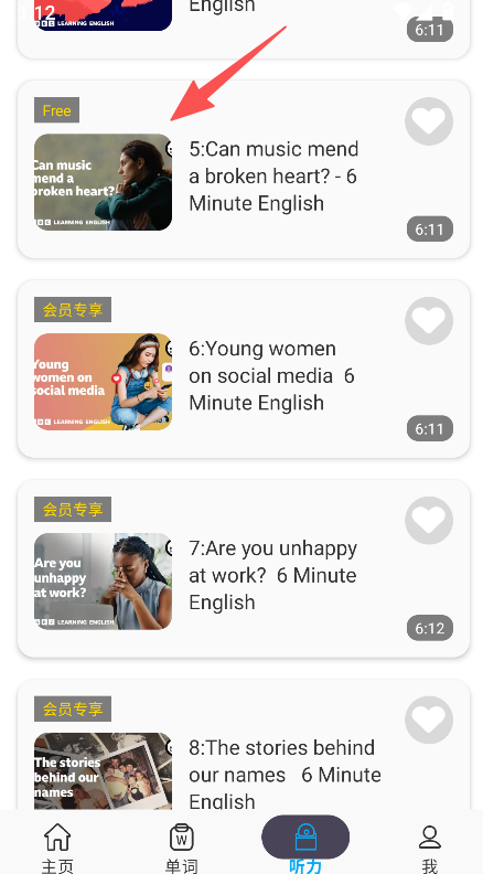2、资源分类清晰,免费与会员内容标注明确,待学习与已学习板块划分清楚,用户可快速找到适合的听力资源,学习效率高。