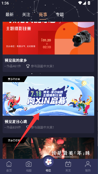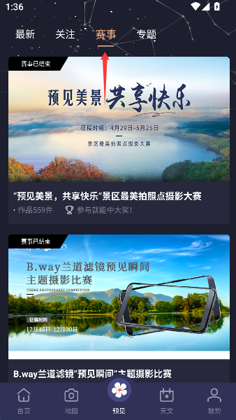 2、接着戳进“赛事”这个选项,里面罗列着天空即将上演的各种自然景观大赛,任君挑选观摩。