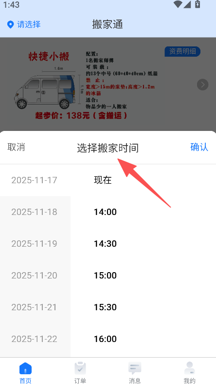 3、提供时间选择功能,支持现在及未来多时段选择,让用户灵活安排搬家时间,适配个人日程。