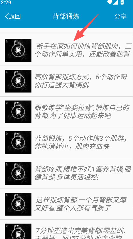 1、打开软件,选择健身分类(如背部锻炼),进入对应列表页。